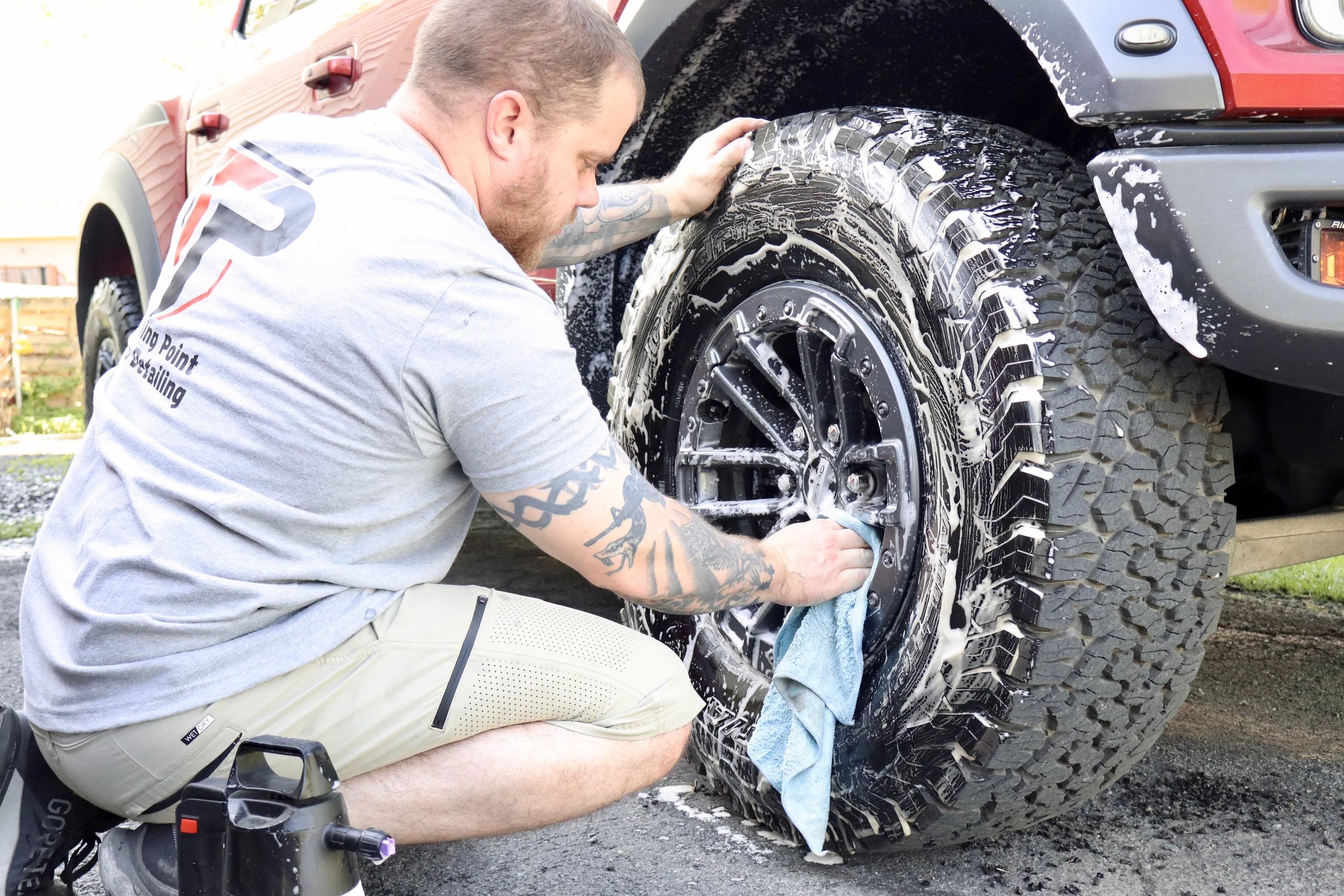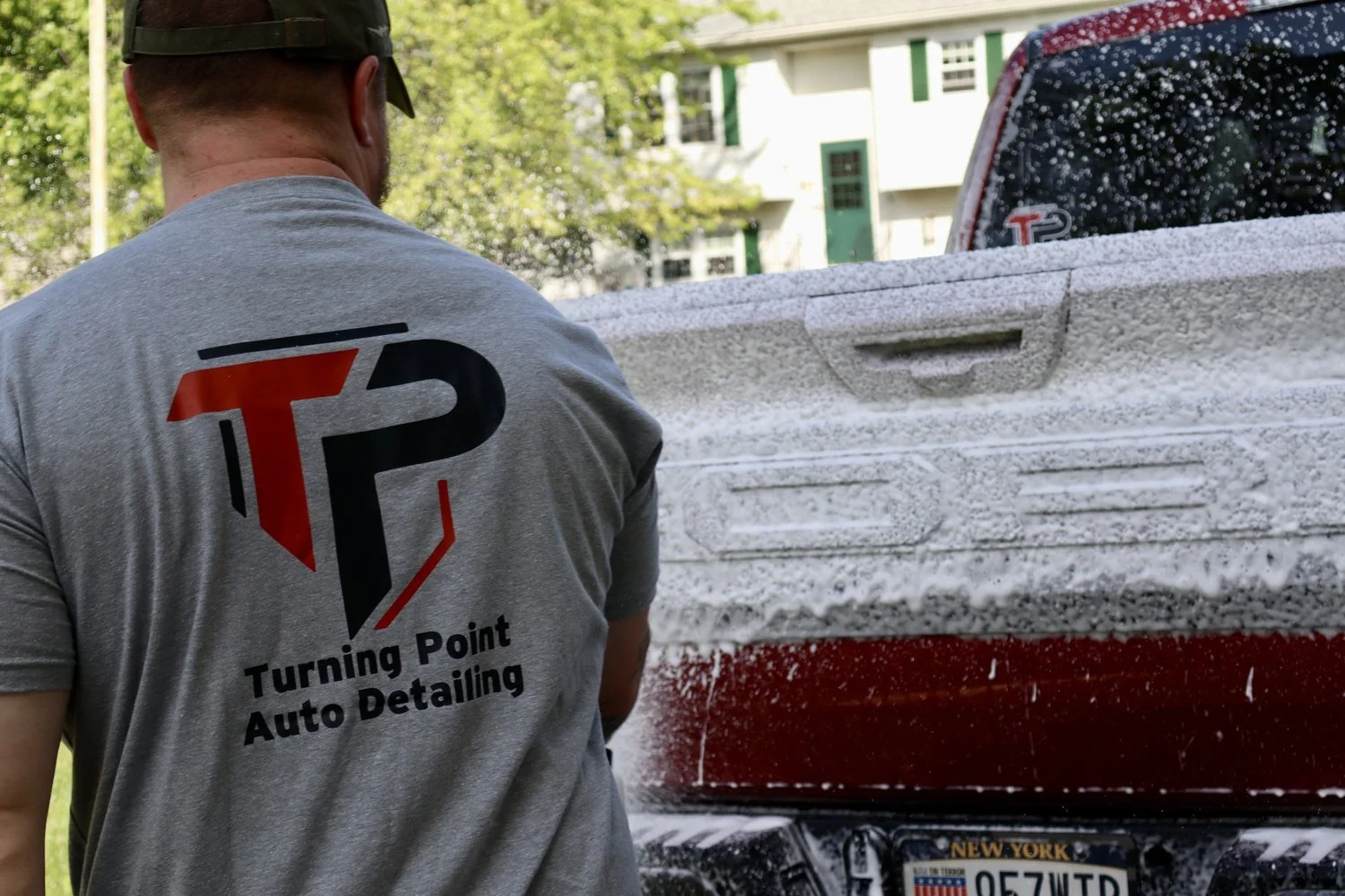 A person wearing a Turing Point Auto Detailing T-shirt cleaning a car with foam at a customers home using mobile detailing equipment. Providing professional customer service and mobile detailing.