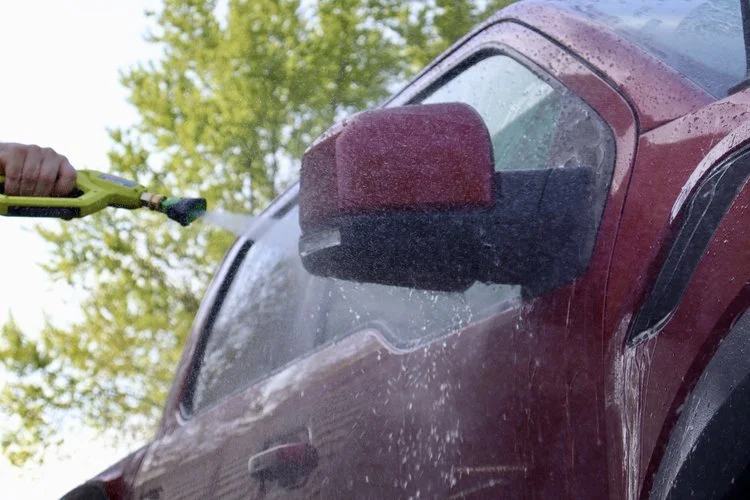 A truck being rinses off after a professional mobile detail of the exterior car wash.